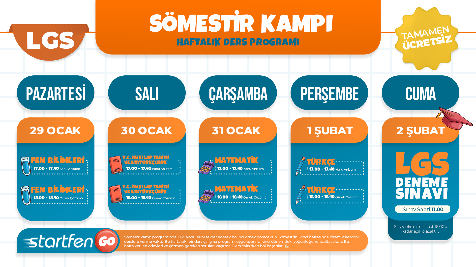 Eğer hala StartfenGO öğrencisi değilsen, endişelenme! 29 Ocak - 2 Şubat tarihleri arasında StartfenGO üzerinden Ücretsiz Sömestir Kampı'na katılabilirsin. Bu benzersiz fırsatı kaçırmamak için hemen kaydol ve sınav hazırlığında bir adım öne geç!